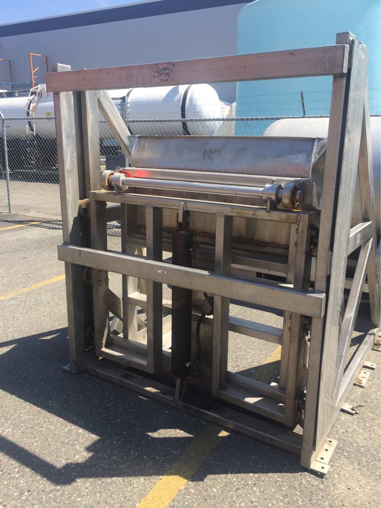 Tote Dumper #1076 All SS Construction Floor Dimensions: 6′ x 64″ x 77″ High Total Dimensions: 48″ x 44″ 48″ Dump Height Carriage dimensions 44 Inches wide x 48 Inches deep Missing Hydraulic Power Pack