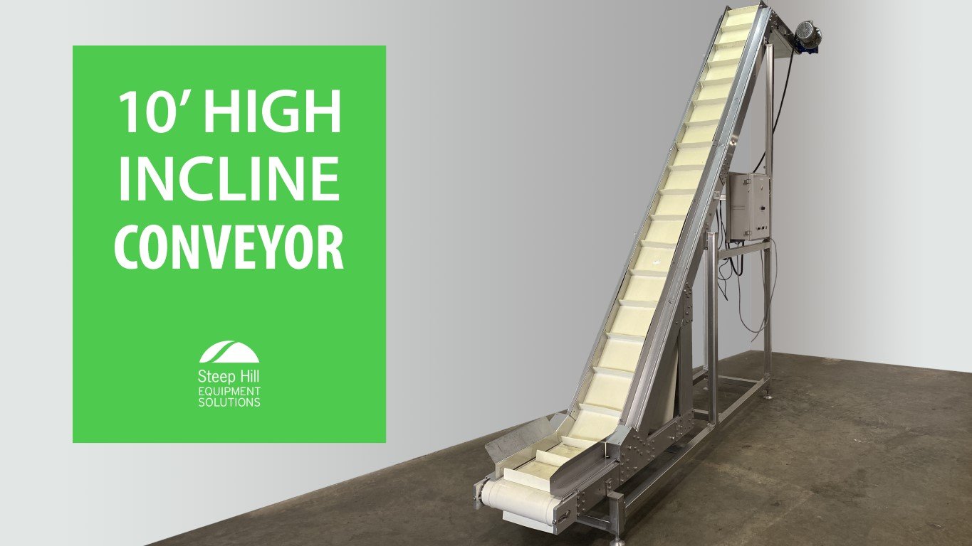 Cleated belt: 182″L x 15″W, usable width: 11.75″ Slope: 140″L Cleats: 11″W x 2″H, spaced 8.5″ apart Infeed height: 13.5″, drop height: 124″