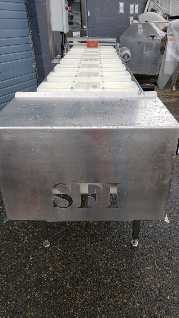 Conveyor height at 39″ Photo-eye halts the conveyor when a hopper or bucket placed at drop point is full. 1884 C5 condition: Good
