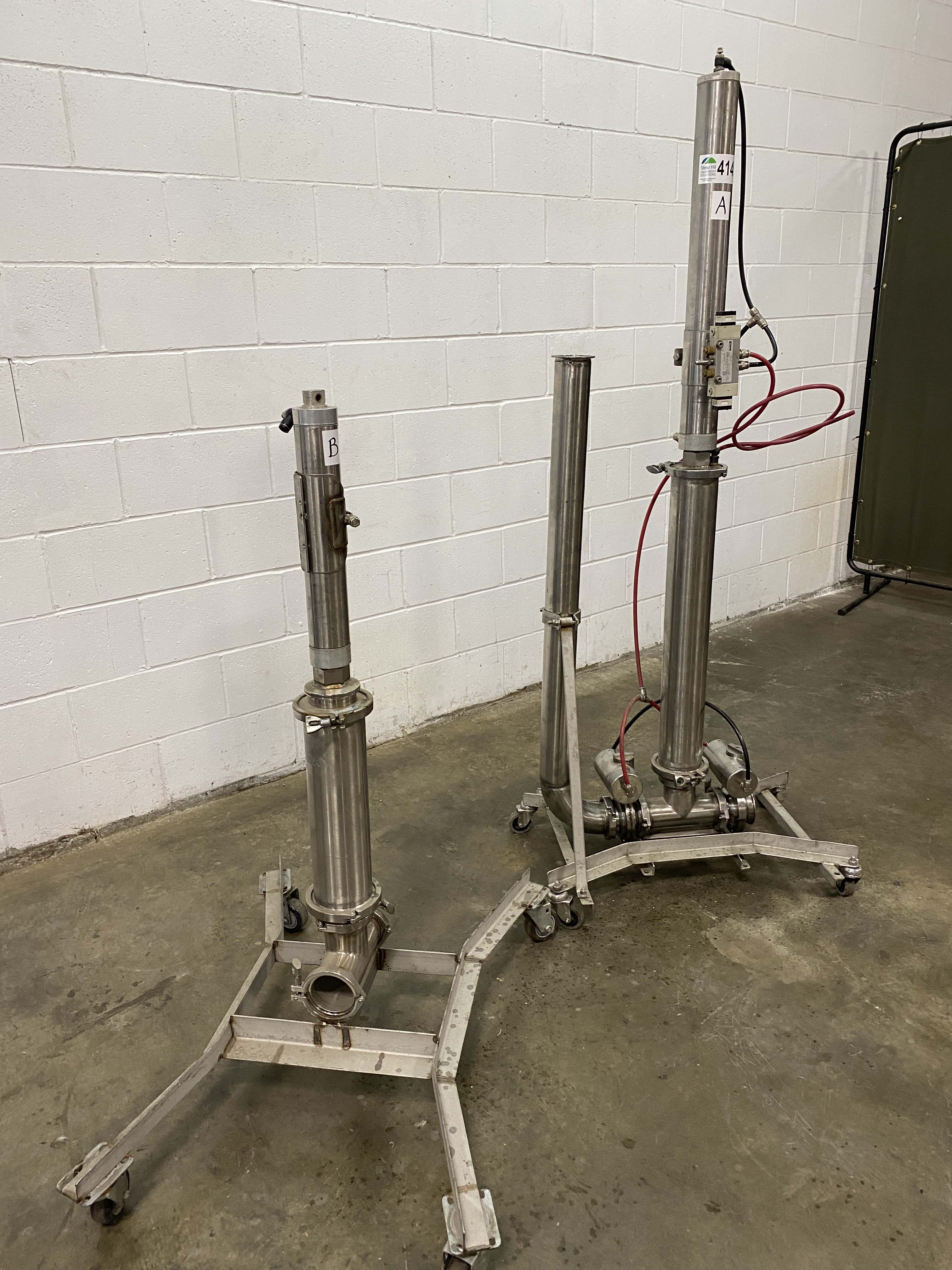The stainless steel transfer pump A has a pneumatic cylinder on top. a piston in the middle with three-way butterfy-valve assembly at the bottom, and an inlet or outlet pipe attached to the assembly.