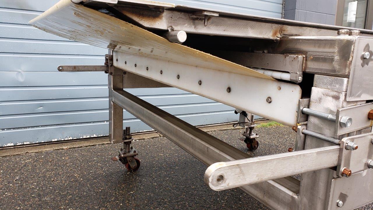 Belt: 75″L x 48″W Belt height from ground: 39″ Adjustable legs. On casters for easy mobility. Needs a new belt and motor.