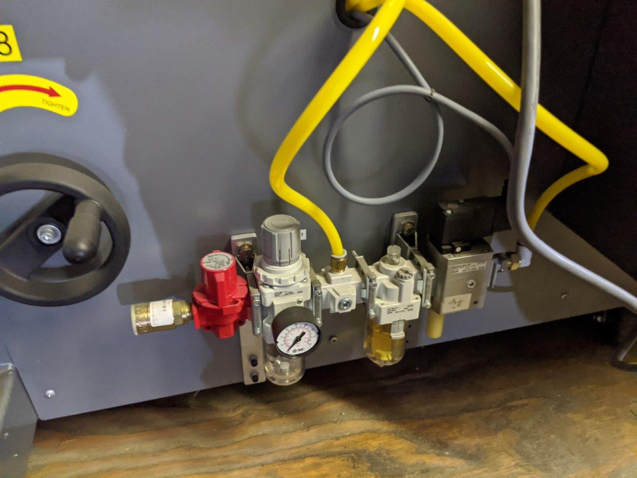 This machine uses air suction to pull cardboard blanks from a gravity fed magazine, then props the box open and seals the bottom so it is ready for packing.
