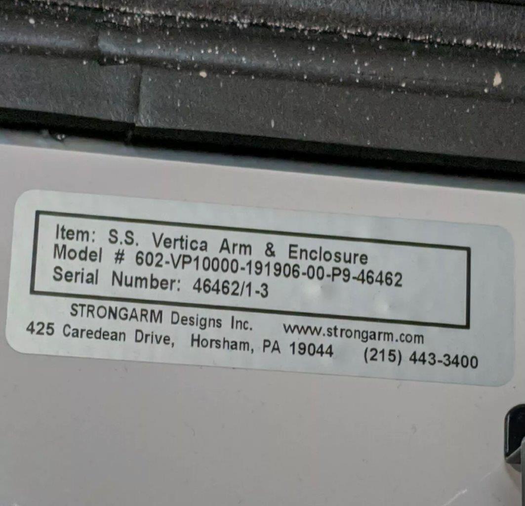 **6 available** HMI Touch Screen Controller Vertica Pendant Arm Model: Vertica™ 602-VP10000 SN: 46462/1-3 Allows an operator to lift, lower, and reposition the enclosure using one hand. FEATURES: • Grab-handle unlocks and relocks vertical position • Sealed cable passageway • 100% counterbalanced • Vertical ranges up to 30″ • Post top mount
