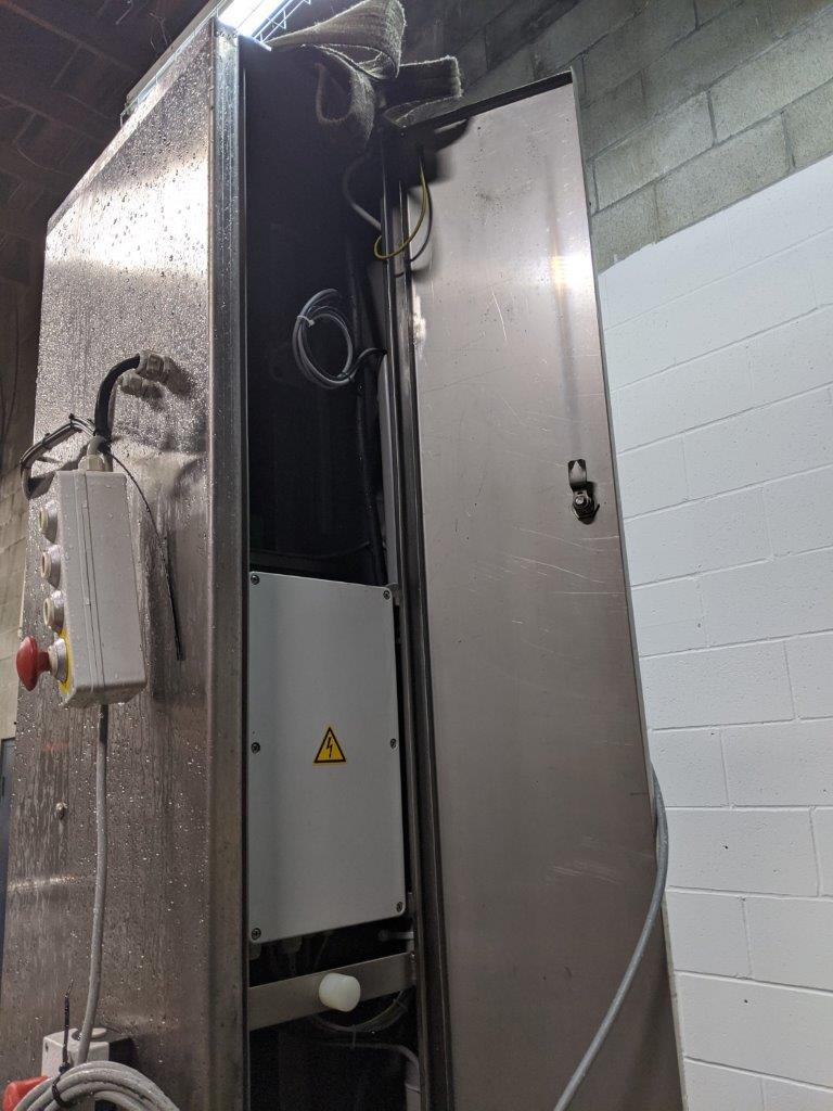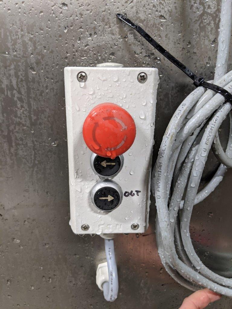 Formerly used in a meat processing plant. Lifting platform: 75″L by 29″W. Overall height of column from floor: 103″ The platform is on slide rails and connected to a 50″ screw to extend or side shift once the target height is reached. Current height will go to 87″ the way it is configured from floor to platform. Height can be adjusted by the sensors within the column. Limit switches are mounted on the column. They are adjustable but currently set close to the upper limit.