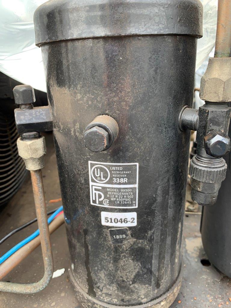 Formerly used as an air dryer on a 40 hp compressor. Hermetic Compressor – Model AWF5524EXT – ideal for small refrigeration systems – Capacity: 24,700 BTUs Two Fans – thermal protected – design pressure 150-450 psi Refrigerant Accumulator – helps control flood back, oil dilution, slugging and migrations. Refrigerant Receiver 338R – Model 99500 – stores liquid refrigerant Penn/Johnson Controls Micro-Set