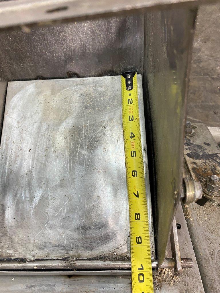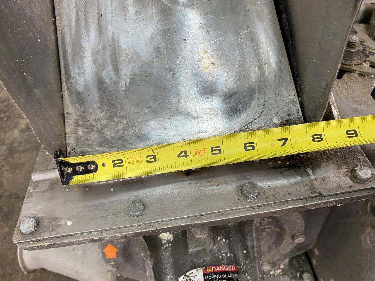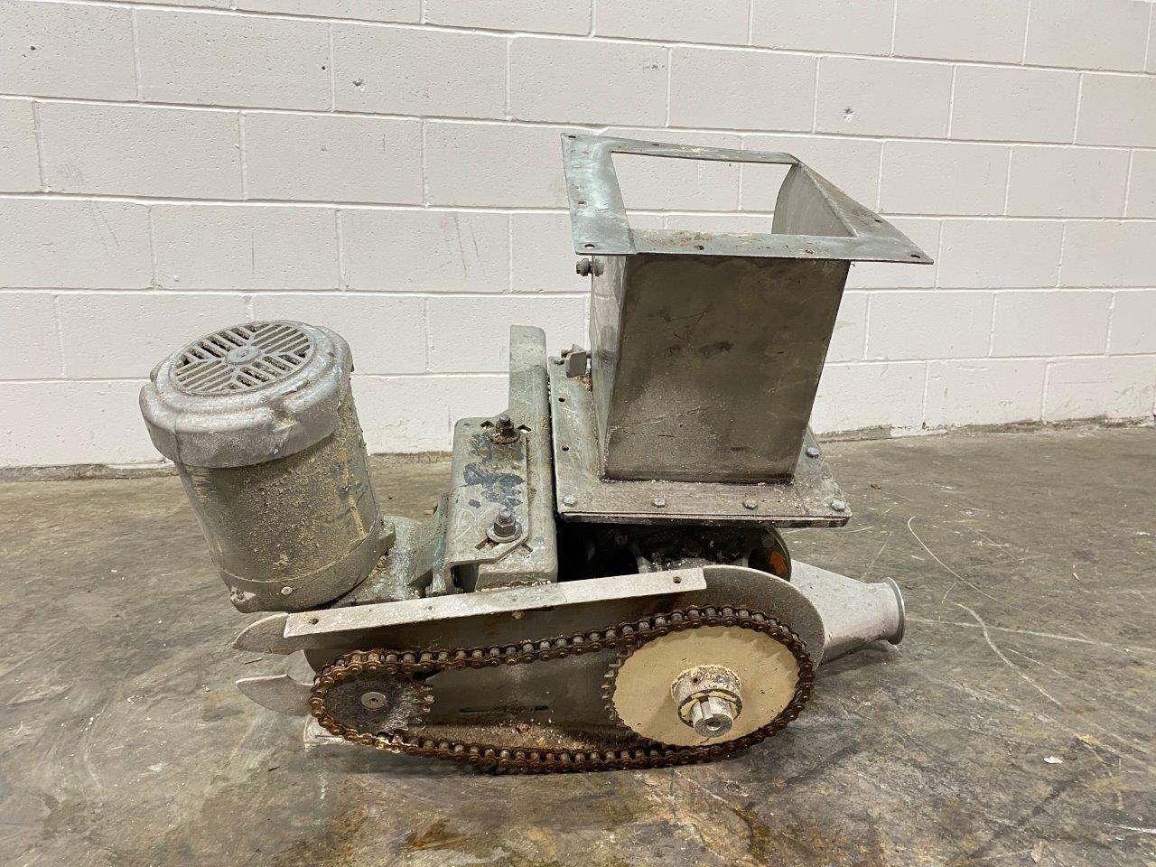 A stainless steel multi-duty rotary airlock valve. Drop-through hopper: 8″L x 8″W, flap: 7¾”W x 9½”H Valve inlet: 8″L x 8″W Discharge outlet: 2¾” diameter Powered by a Unimount 125 Electric .75 hp motor and Syncrogear Module 2639 B8