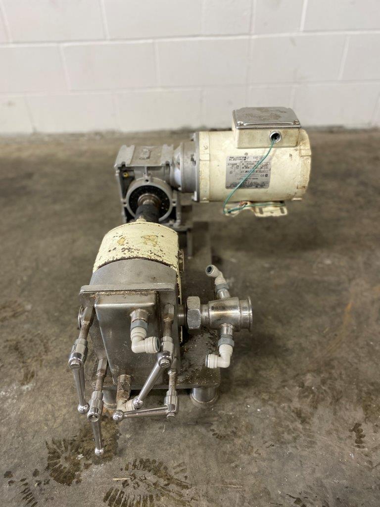 A high viscosity pump with a hot-water jacket previously used for chocolate. Suction: 1½” diameter Discharge: 1½” diameter Star-shaped impellers: 4″ across Powered by a Reliance Electric 1 hp motor 2665 AA7 – 5