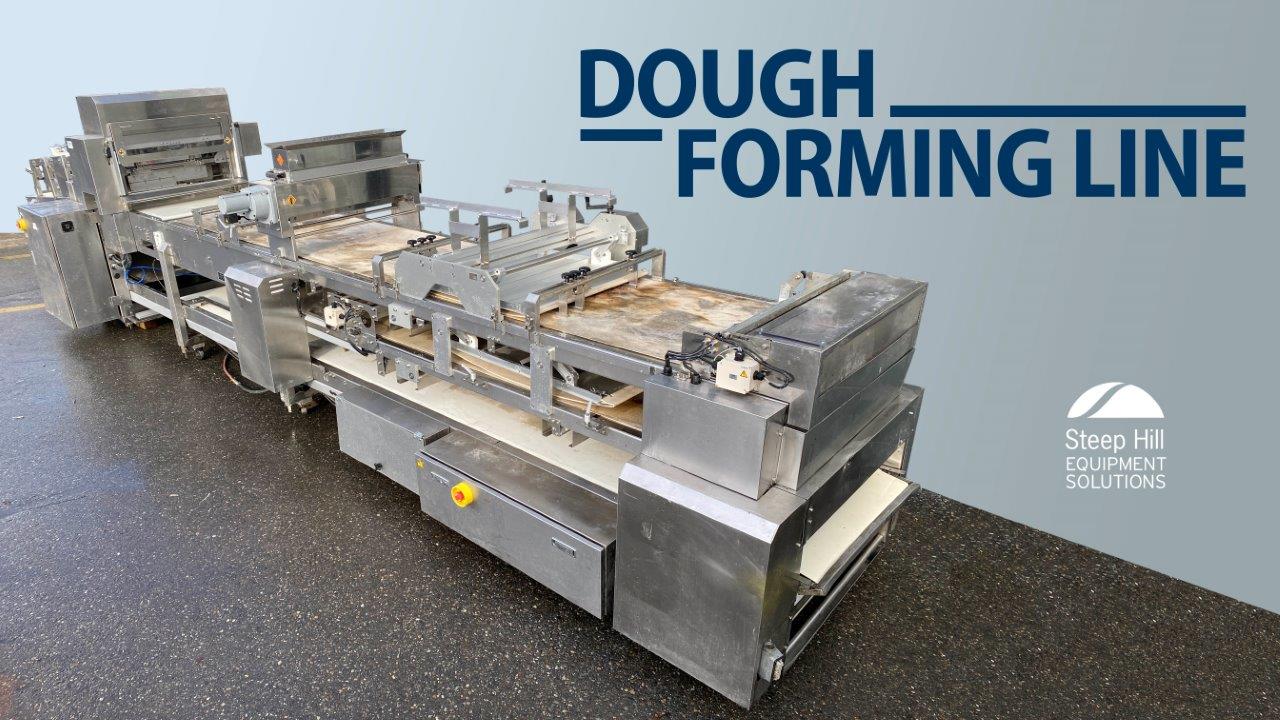 Previously part of a baguette line. Includes the following, from right to left (see photo for reference): 1F303 Forming Device DF202 Flour Duster, with a Yaskawa Varispeed 606PC3 Inverter 1F053 Forming Conveyor 0K909 Guillotine Cutter, with a Rheon Gravimetric Unit which measures weight and/or length. 3C476 Separate Conveyor Top conveyors, from right to left: 163″L, 44½”L, 80″L, all three are 31½”W Middle conveyor: 95″L x 31½”, bottom conveyor: 185″L x 31½” Roller conveyors: top: 14″L, bottom: 28″L Lapping conveyors: 22½”L x 10″W, small lapping conveyors: 8″L x 4¾”W 2711 JS