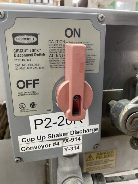Stainless steel tubular frame support. Modular belt: 94″L x 40″W, working height: 31½” Center diverter: 48″L x 6″W Hopper: 8″ diameter Chutes: 32″L x 6″W Comes with a Sew-Eurodrive 3/4 hp motor and gearbox, as well as a Hubbell Circuit-Lock disconnect switch. 2790 C5 condition: Good