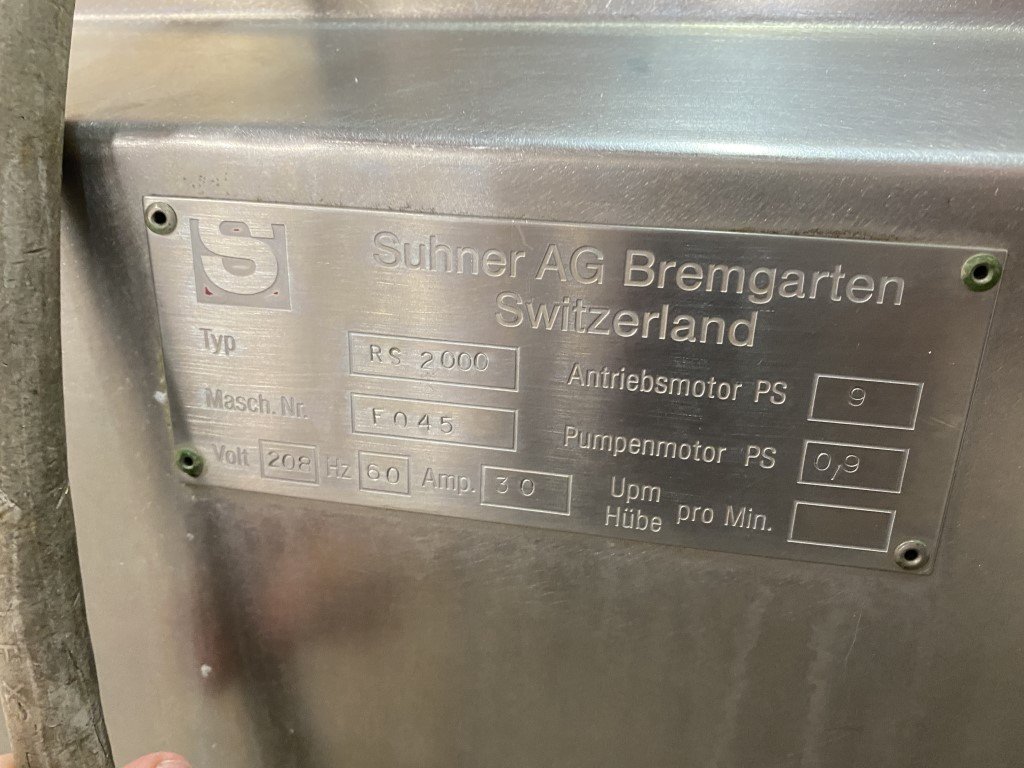 Sausage stuffer produces high compactness and density. Production rate: 11,000 kg / h Max portion weight: 32,000 grams Hopper: 38″ diameter x 30″ deep, volume approx 450 liters Automatic load feature: max 133 kg / 250 lb Comes with a Risco hydraulic system, and a Rüetschi 0.66 kW motor. 2758 DD1