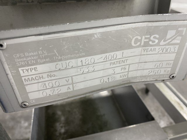 Stainless steel food-grade wire belt: 16″W Guide rails on inside curve: 1.5″H Outside curve: 68″ from side to side, inside curve: 44.5″ Adjustable work height at legs. Currently: 45″H Four locking caster wheels. Powered by a Siemens 0.18 kW motor, and a Stroter gearbox. condition: Good