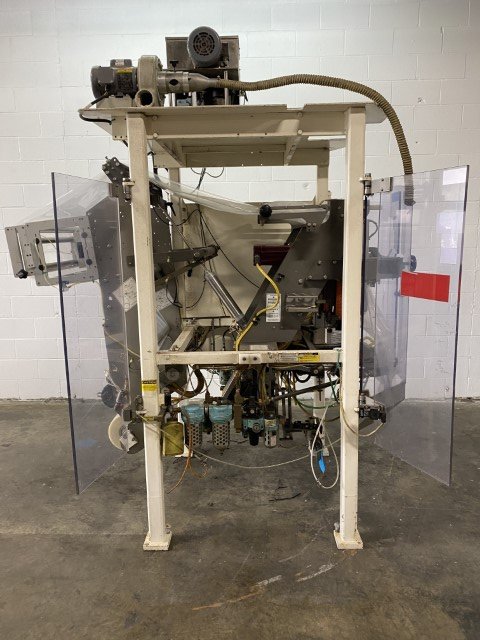This vertical form, fill and seal bagging machine uses a Spee-Dee CHE 386 filler. Guide belts: 16″H x 2″W Heat sealer: 17″W Film: 32″W Comes with the following: Forming tube: 33″L x 21″W x 44″H Baldor motors, one 1/3 hp and the other 1/8 hp Pacific Scientific 1.8 step motors (2) Wilkerson filter and regulator system Lincoln Centro-matic grease lubricant ram pump Videojet DataFlex Plus thermal transfer overprinter.