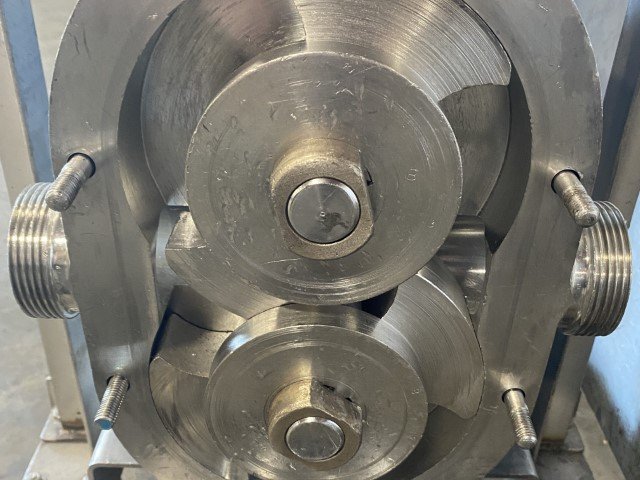 Stainless steel rotary lobe positive displacement pump, with a Sew-Eurodrive 1.5 hp motor and gear speed reducer. Displacement per revolution: 0.15 gallons Nominal speed to 600 rpm, capacity to 90 gpm, temp range: -40°F to 300°F Pressure: 150 psi Inlet/outlet ports: 2″ dia Table top surface: 32″ x 23″ Casters: 4″ dia x 1.25″ thick Tested working condition.
