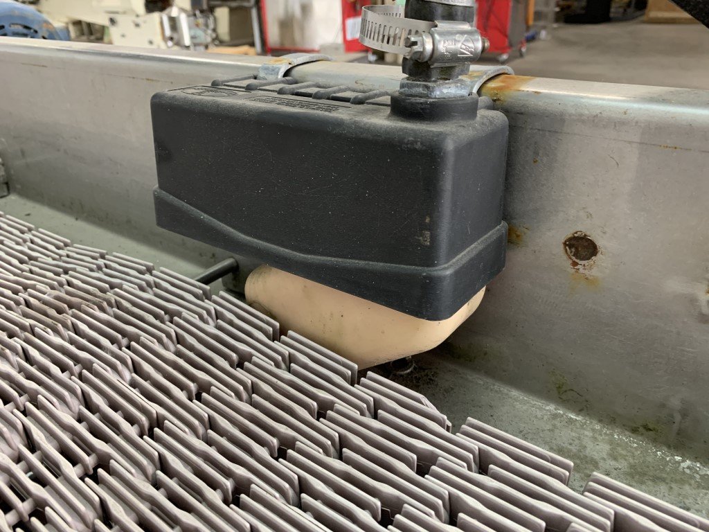 Modular belt: 107″L x 27″W Trough: 108″L x 32.25″W x 6″D Has a Mueller R910 ball shut-off valve. Adjustable height at legs. Powered by a Lesson 1 hp electric motor and a Motovario gear reducer. Needs a variable speed drive.