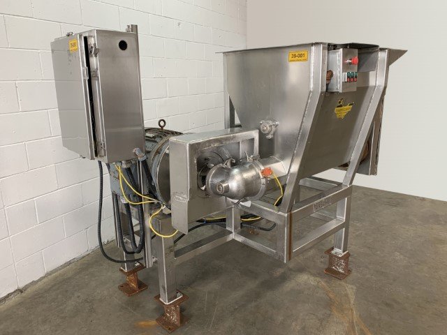 Large hopper capacity with positive feed assistance, this processor’s common applications includes vegetables, meat, seafood, and bakery rework. Infeed hopper: 30.75″L x 22.5″W x 28″D Agitator: 30.5″L Feed screw approx 37″L x 7″ dia Impeller: 3 v-shape blades 3″L and 3″W at base. Powered by a GE Tri-Clad 40 hp AC motor. Other motors include a Louis Allis Pacemaker 3.0 hp motor, with a Louis Allis Allispede 3.0 hp motor, as well as a Baldor Super-E 2 hp that runs the belt, and two Boston Gear Reductors for the agitator and feed screw. Previously used to grind meat.