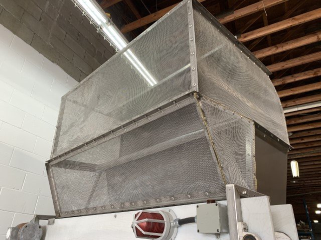 Berries are fed directly on inclined infeed conveyor and conveyed through air stream and onto stainless steel wire conveyor. Small lighter berries, leaves, and debris follow the air stream into the overhead cage where it is conveyed out to one side by the refuse conveyor. Inclined infeed conveyor: 75″L x 38.5″W, infeed height: 45″ Powered by a Motovario motor and gear reducer. Wire conveyor: 30″L x 39″W, discharge height: 54″ Powered by a Leeson 1/4 hp washguard motor. Refuse conveyor: 81″L x 7.75″W, discharge height: 73″ Powered by a Leeson 1/4 hp washguard motor. Overhead cage discharge above refuse conveyor: 58″L x 7″W Double blowers powered by a Leeson 10 hp washguard motor, but needs a speed drive. Needs control panel.