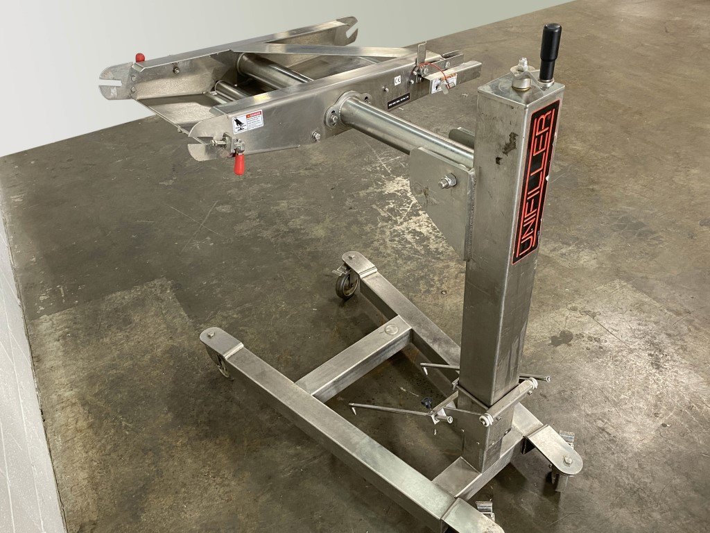 Conveyor frame for a depositor. Height is adjustable with crank handle. Roller: 15″W x 1.5″ diameter