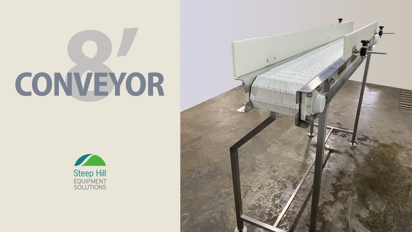 Belt: 94″L x 9″W, work height: 55.75″ Side panels: 5.5″H, one 72″L, the other 96″L Powered by a Sterling 1.2 hp electric motor and a hollow-shaft right angle reducer.