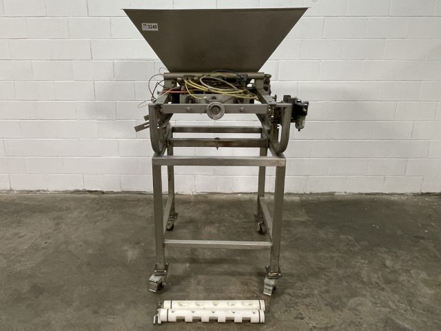 The Hinds-Bock 5P-08T Muffin Depositor is a versatile, pneumatic, five-piston machine designed for efficient baking operations. It is excellent for depositing batter for muffins, cupcakes, and sheet cakes. With a depositing capacity of 2 to 8 ounces, it achieves a throughput of 900 to 1,300 dozen per hour, making it suitable for high-volume production. This used model was originally designed as a tabletop unit but is now mounted on a 33" L x 32" W x 38.25" H stand. With a batter infeed height of 73" and a deposit height of 48", it ensures easy handling and operation. The hopper's large volume of approximately 120 quarts (30 gallons) enhances productivity by reducing the need for frequent refilling. In addition, the depositor comes with two extra deposit rollers, providing flexibility and extended operational possibilities. Measuring 48" x 43" x 74", this pneumatic machine is an efficient addition to any bakery setup.