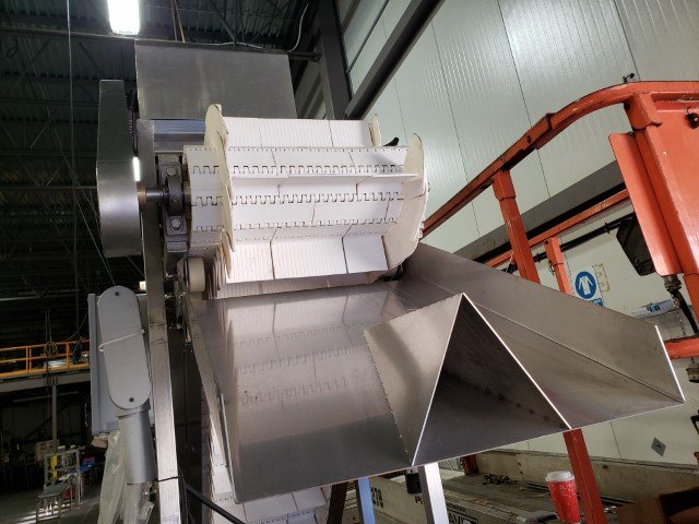 Cleated z-style incline conveyor Modular belt: 126″L x 15″W, useable: 13″W Cleats: 13″W x 2″H Infeed: 24″H, discharge: 90″H