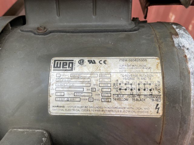 Flat belt conveyor: 181″L x 29.5″W High side: 58.5″ from ground, low side, 41.5″ from ground. Powered by a WEG 1 hp motor.