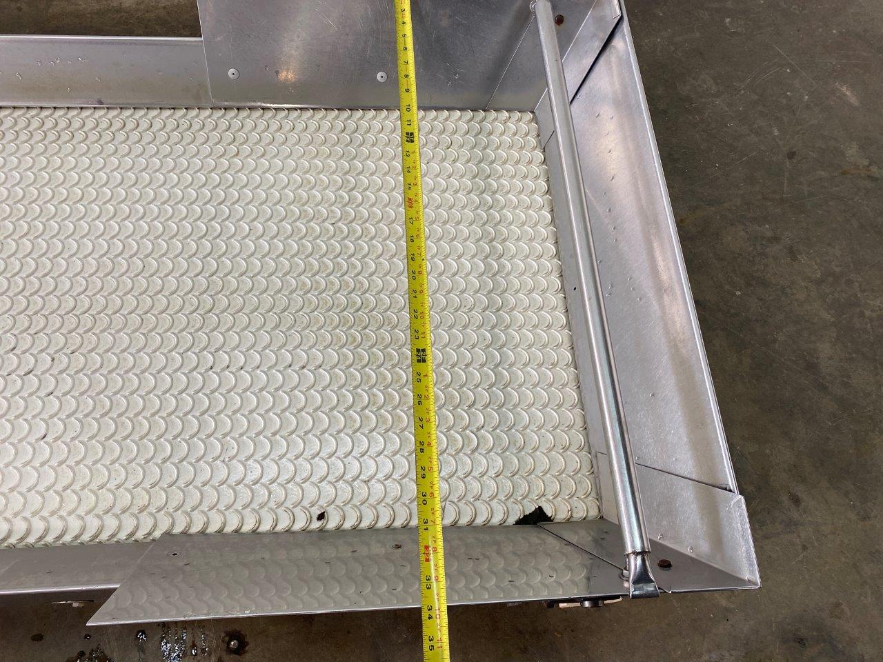 Usable belt: 76″L x 26″W Hopper: 24″L x 34″W at top, 7″ deep No motor; sprocket on driven end.