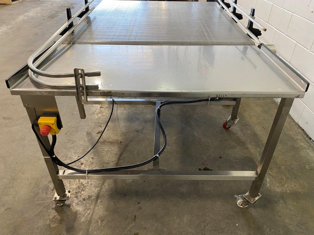Modular belt” 58″L (usable 55″L) x 48″W Stainless steel table top: 47.5″W x 24″L Work height where conveyor meets table: 33.5″ Powered by a Baldor motor and right angle speed reducer.