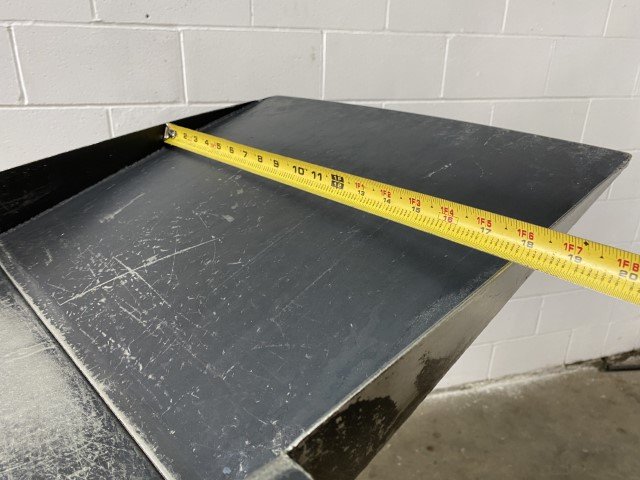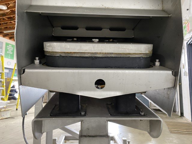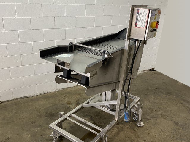 Stainless steel vibrating conveyor with speed of 1200 rpm and stroke of 0.25. Conveyor pan: 72″L x 18″W, end section expands to 22″W 5/8″ diameter perforations on pan with funnel below. Other perforations are 6″L x 0.25″W. Infeed (sloped end) 53.5″ from ground, outfeed: 48″