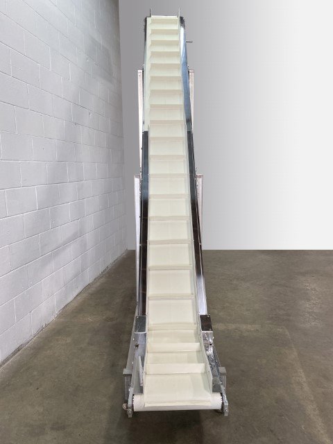 Belt: 178″L x 15.5″W, usable width: 12.25″, slope: 138″L Infeed height: 13.75″, drop height: 101″ Cleats: 12″W x 2″H, spaced 7.5″ apart Side rails: 3.25″H Requires a motor to operate.