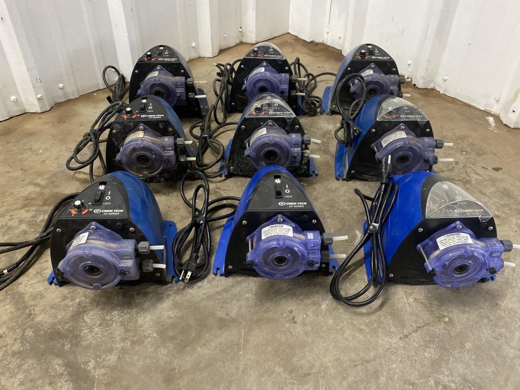 PulsaFeeder peristaltic metering pumps: Lot of 9 Internal timer accepts pulses from a contacting head water meter. Adjustable to run the pump from .1-1 sec, .2-10 sec, or from 1.0-60 sec per pulse. Nominal output: 7 GPD / 1.1 LPH Max working pressure: 125 psi / 8.6 bar Speed: 50 rpm