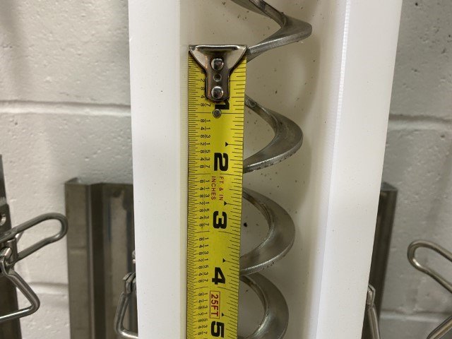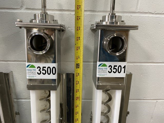 3496, 3497, 3498 (SOLD), 3499 (SOLD) Augers: 48″L x 2″ diameter, flight: 2″ Trough: 48″L x 3.5″W, inside 2.25″W x 2.75″D Infeed: 2″ diameter, with flange: 2.5″ Removable covers. Overall dimensions: 52″ x 5.25″ x 5.25″ 3500(SOLD), 3501 Augers: 40″L x 1.75″ diameter, flight: 1.88″ Trough: 40″L x 3.25″W, inside 2″W x 2.5″D Infeed: 2″ diameter, with flange: 2.5″ Removable covers. Overall dimensions: 44″ x 5.25″ x 5.25″ Two extra dust covers available upon request. Covers: 53.5″L x 4″W x 4″D