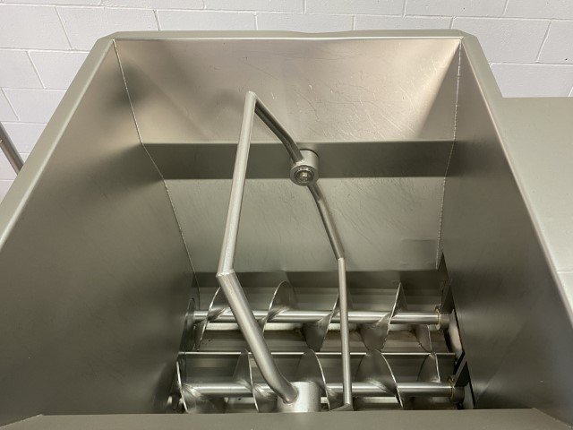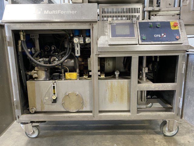 The GEA MultiFormer is an easy-to-use plate former that uses air and water to knock-out products. It is designed for low to medium capacity forming of red meat, poultry, fish, seafood, vegetables, and meat replacement products. Infeed hopper: 29.5″L x 33″W x 24″D, at augers: 26″L x 15″W Capacity: 270L Each auger: 26″ long x 7.5″ diameter Platform: 17.5″L x 24.25″W x 55″H (from ground) Outfeed wire conveyor: 35″L x 15.75″W, drop height: 40.75″ Screen tray: 11.75″L x 28″W