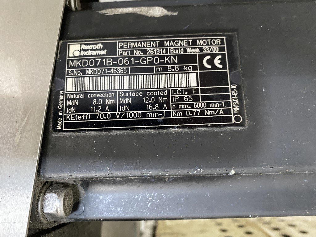 Flat belt conveyor with 4 rows of 3/8″ diameter perforations. Belt: 60.5″L x 9.75″W Work height – motor side: 33″ from ground, other side: 32.5″ from ground Powered by a Rexroth Indramat permanent magnet motor. Needs a control panel.