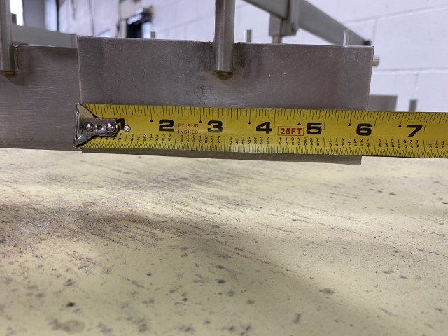 Guide rails combine or separate product into processing lines. Conveyor belt: 70.75″L x 41.25″W Work height: 49.25″ Cross bars: 8″H Adjustable guide rails. Powered by a SEW-Eurodrive 1.5 hp motor and gearbox.