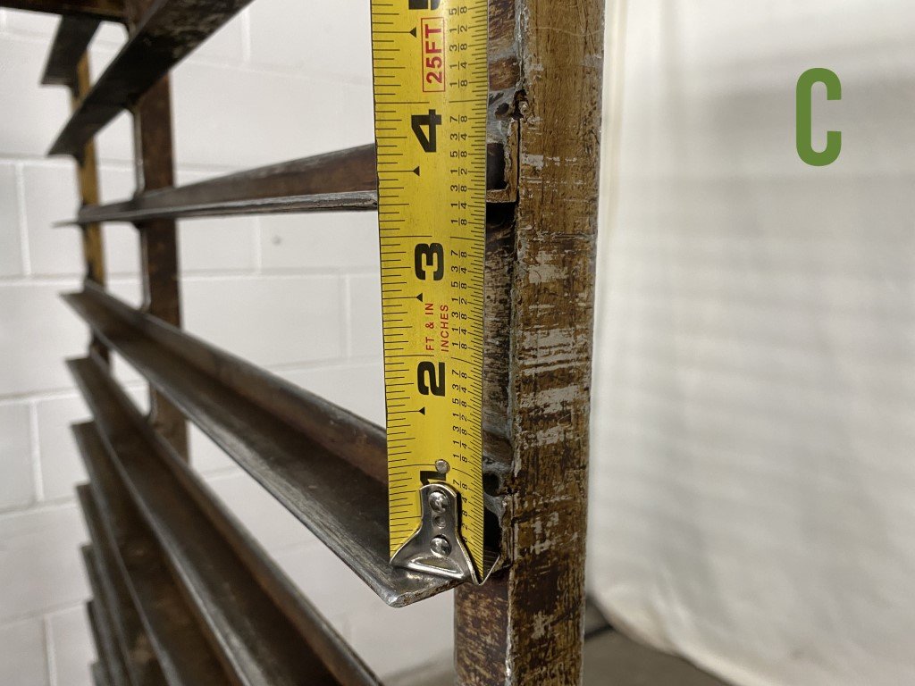 Roll-in trucks for ovens and proofers. Three (3) available. Each truck has 17 rows that fit up to 34 sheets pans, 2 per row. A – 1 sheet pan screwed to the top row. B – 2 sheet pans welded to top row. C – 2 sheet pans welded, 2 are not. Truck outer dimensions: 28″ wide x 36″ deep x 68.75″ tall Sheet pans: 25.5″ x 18″