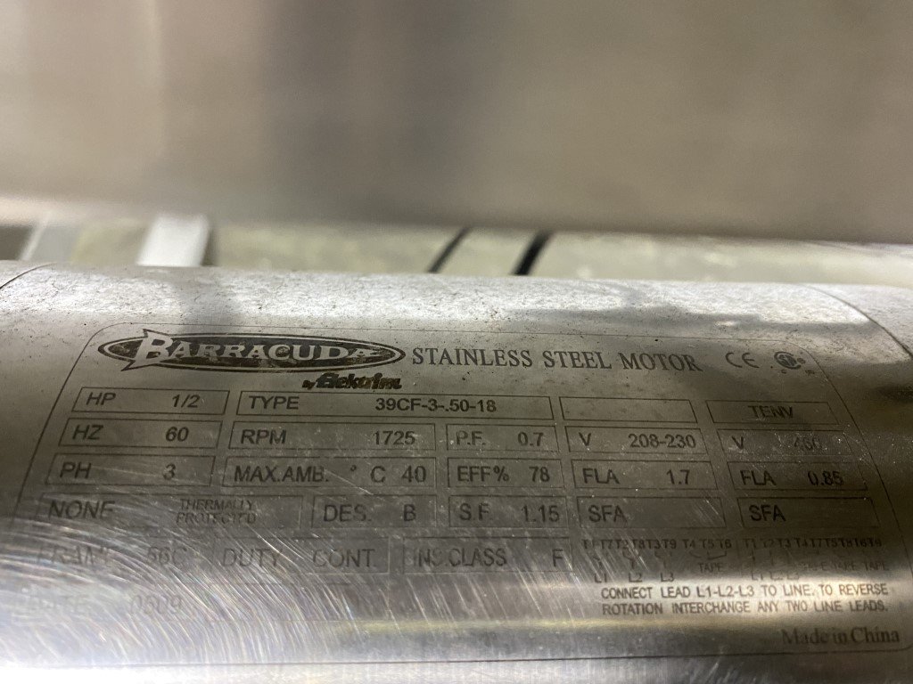 Incline conveyor powered by a Barracuda 1/2 hp SS motor and Winsmith speed reducer. Modular belt: 90″L x 20″W Infeed: 24″H, off-load: 41″H
