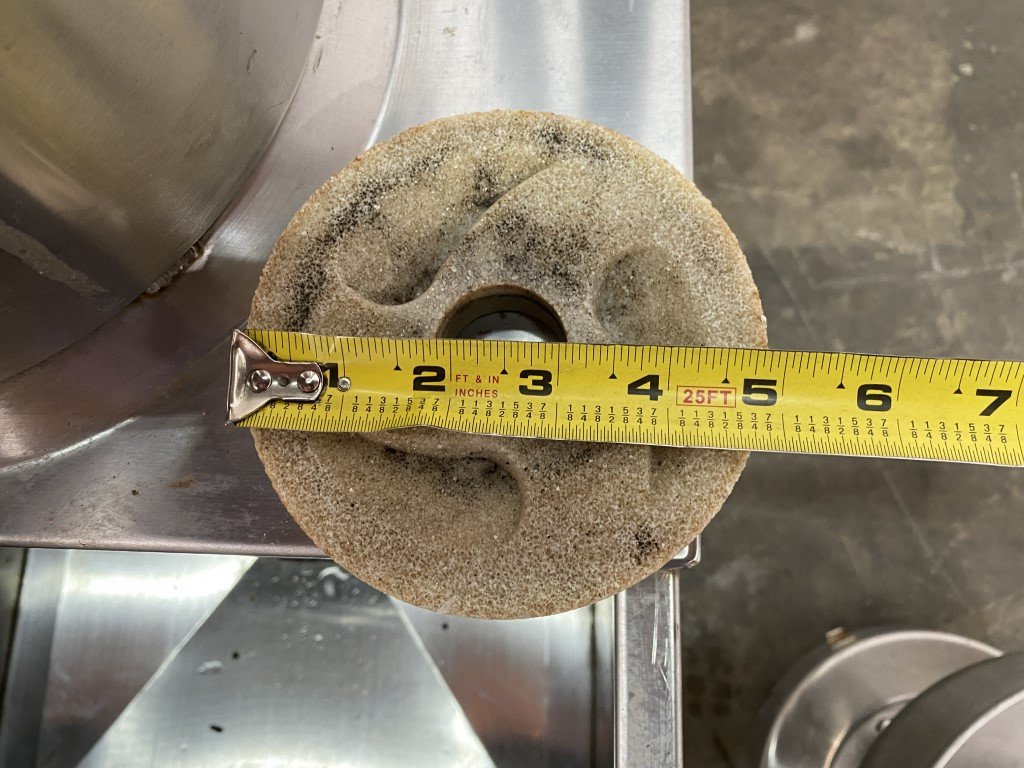 Soy bean grinder and separator that produced soy milk and soy bean pulp (okara). Infeed hopper: 11.75″ diameter x 8.5 deep, straight side 3″, bottom outlet: 1.75: diameter Filter cone: 10.25″ diameter x 6″ deep, with flange: 11″ diameter Grinding stones, made of white corundum: 5″ diameter. Top stone has 1.75″ diameter center infeed. Tub: 10.25″ diameter x 7″ deep Pulp outfeed chute: 9″L x 8.25″W x 3.75″H Spout: 2.25″W x 1.25″H, empties soy milk into holding tank: 18″Lx 12″W x 18″D A Zhongfu 120 watt pump transfers the soy milk to the semi-insulated tank: 20″ diameter x 23″ deep. Grinder powered by a 1.5 kW asynchronous motor. Needs 100 mesh filter for soy milk.