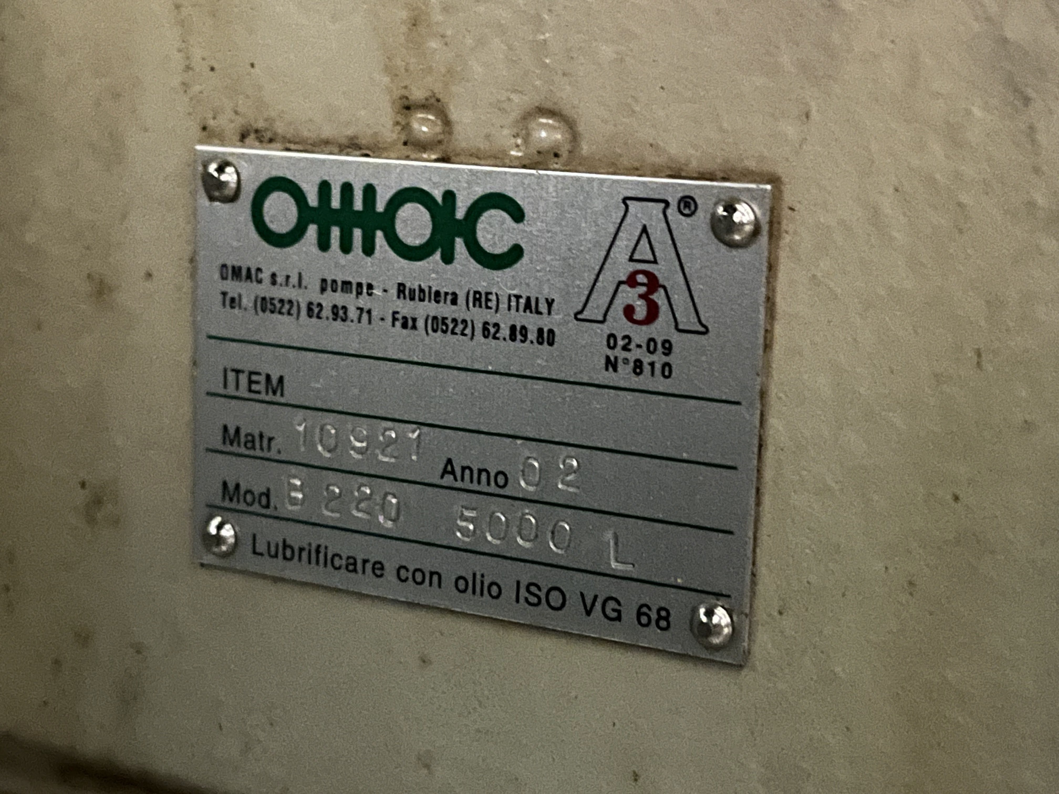 - Pump: OMAC B220 dosing lobe pump