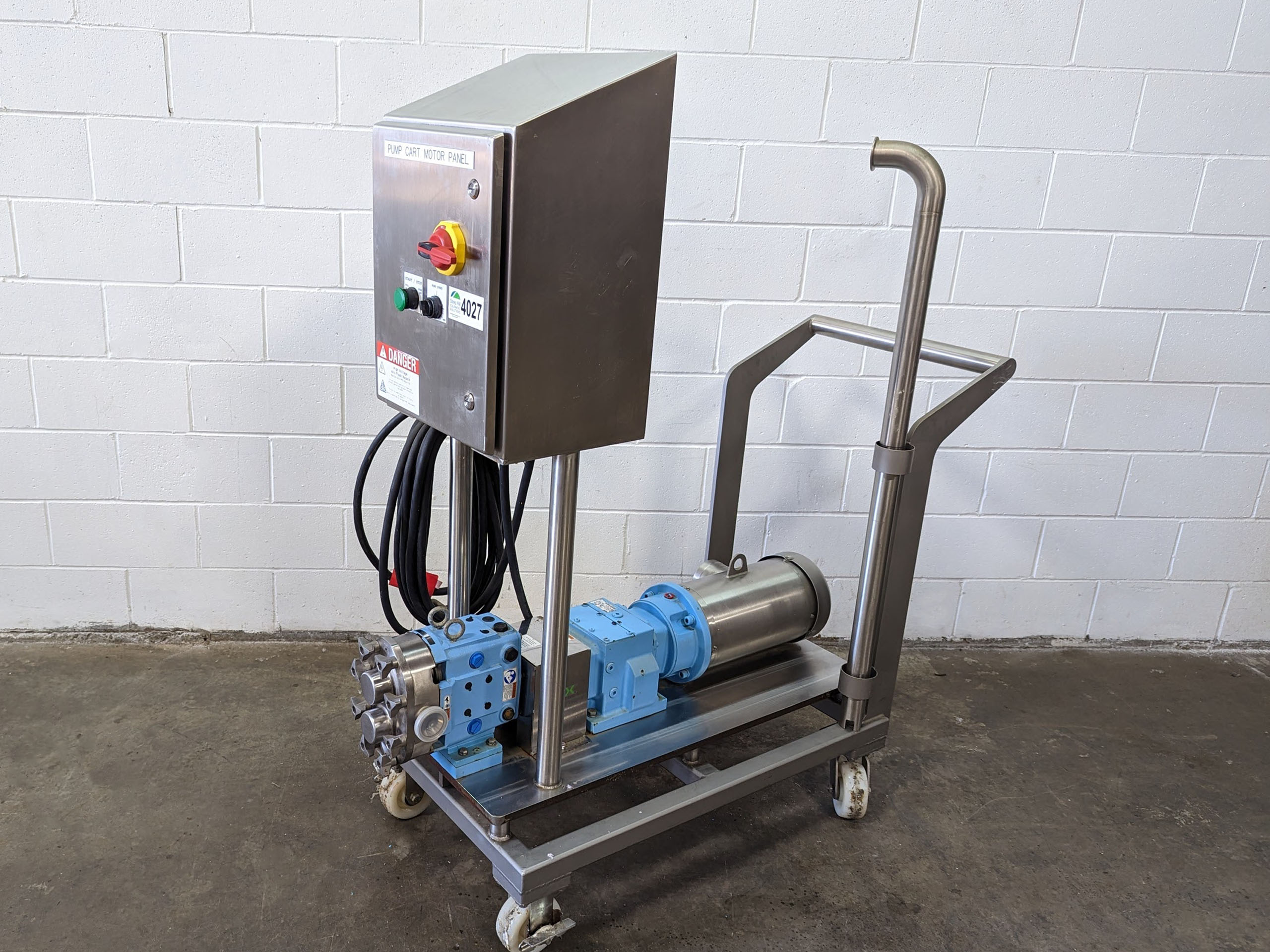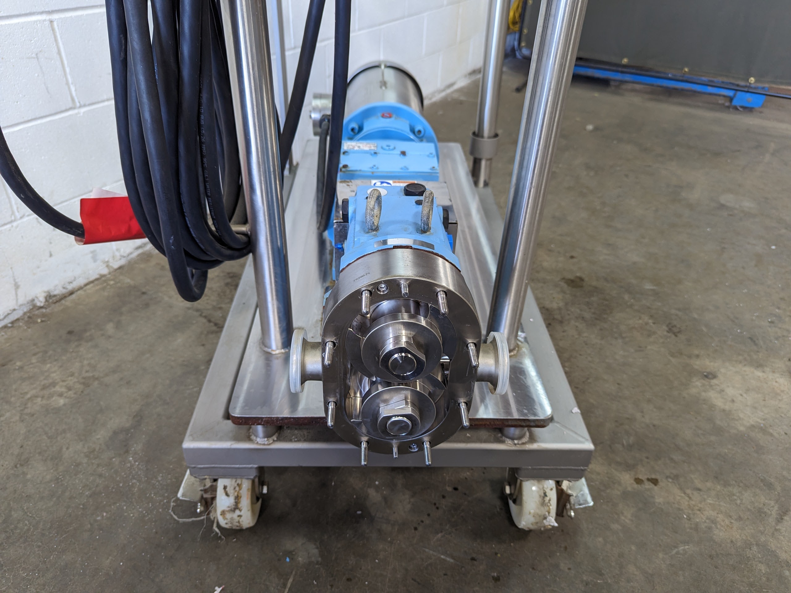 Positive displacement pump mounted on a rolling cart with a VFD in a washdown enclosure.