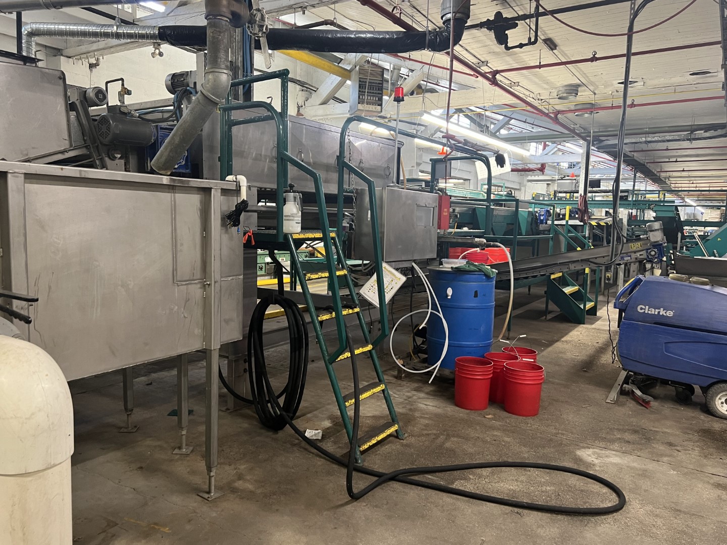 A complete pear processing packaging line with one-way sizer, tubs, conveyors, rotary tables and more. It will clean, sort, and size, as well as box or crate the fruit.