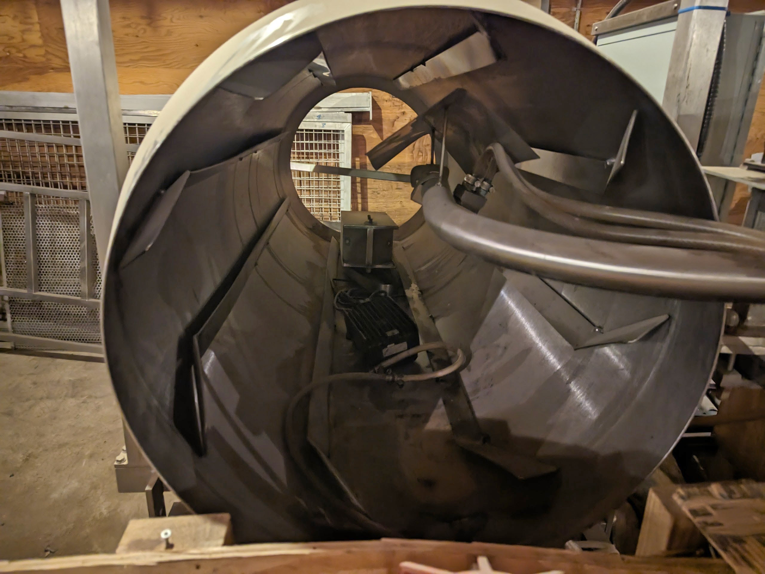 A rotary multi-flight seasoning drum with oil sprayer gently coats seasonings on to product.