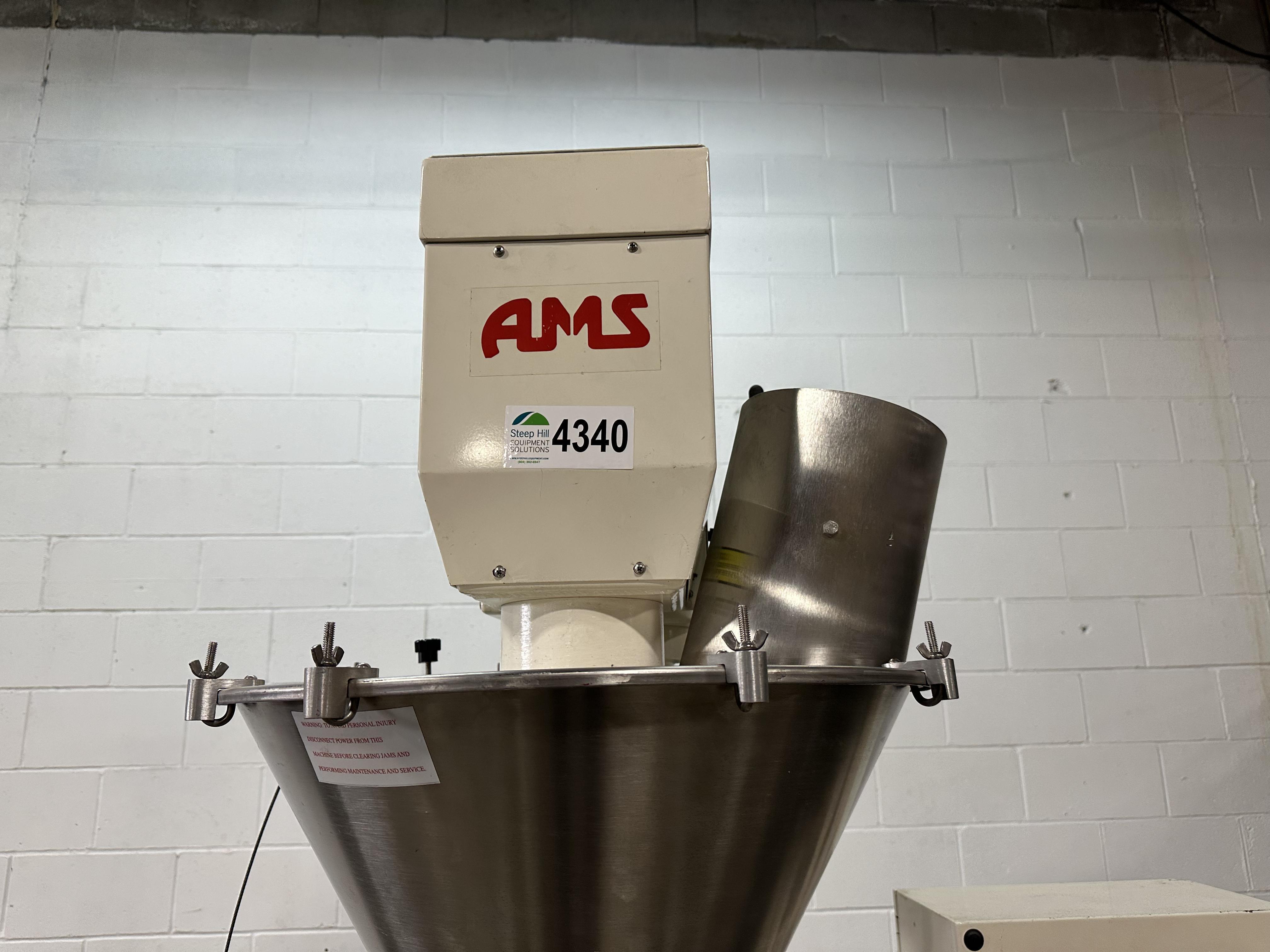 Model A-600 automatic auger filler agitated hoppers and dust proof covers, 7" OD product feed ports, level sensors and vibratory container lift. Control panel with an AB PLC and touch screen HMI.