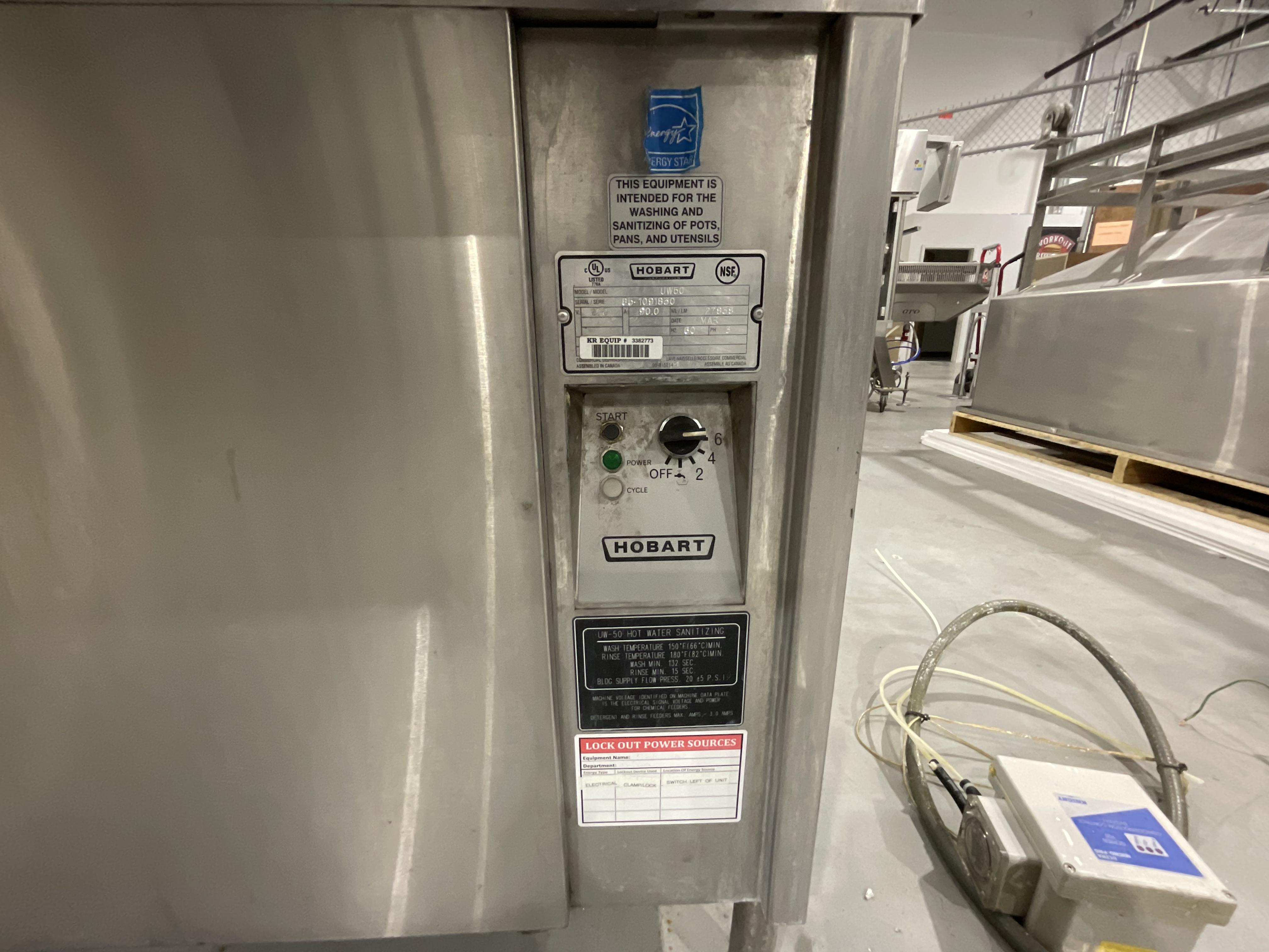 Used Hobart Commercial Utensil Washer in good working condition, showing cosmetic scrapes and hard water stains. Designed for efficient cleaning of pots, pans, trays, and utensils in commercial kitchens.