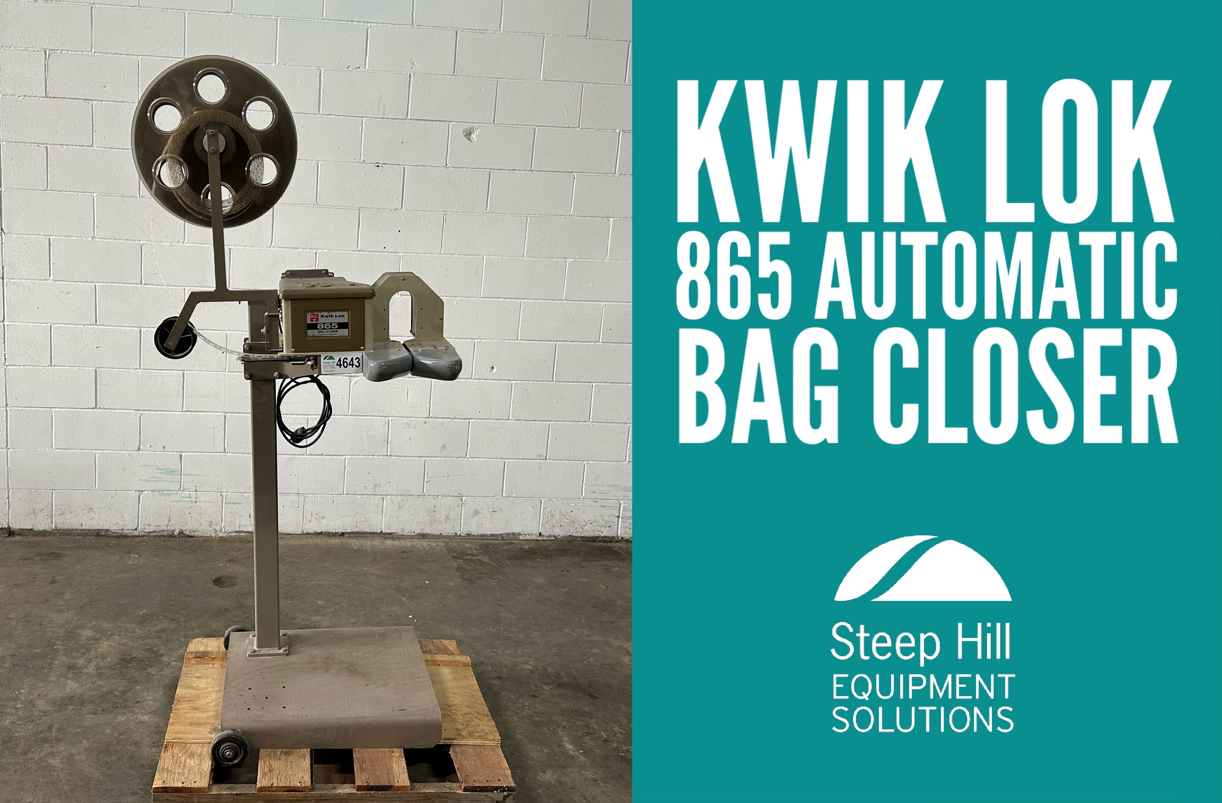 The Kwik Lok 865 Automatic Bag Closing Machine closes packages using bag closures and Striplok bag closure-labels. The machine is equipped with variable speed control for closing up to 80 packages per minute. The 865 will close any package width without adjustment and will adapt to most automatic bagging operations on the market.