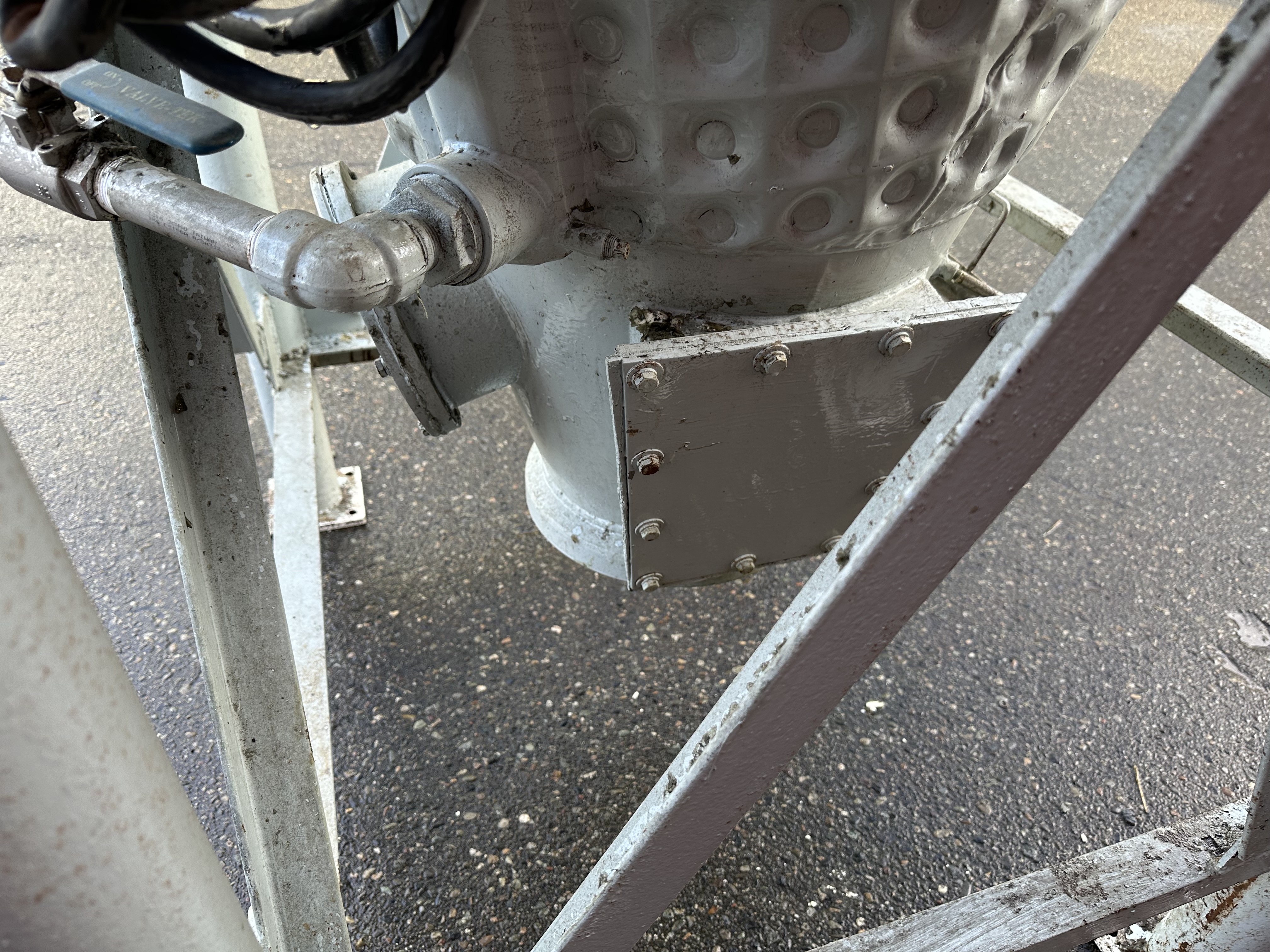 The mixer is a conical screw mixer designed for segregative, free-flowing powders, and pastes. It features a double-acting screw that rotates around the tank interior for mixing action. Previously used for mixing chemicals.