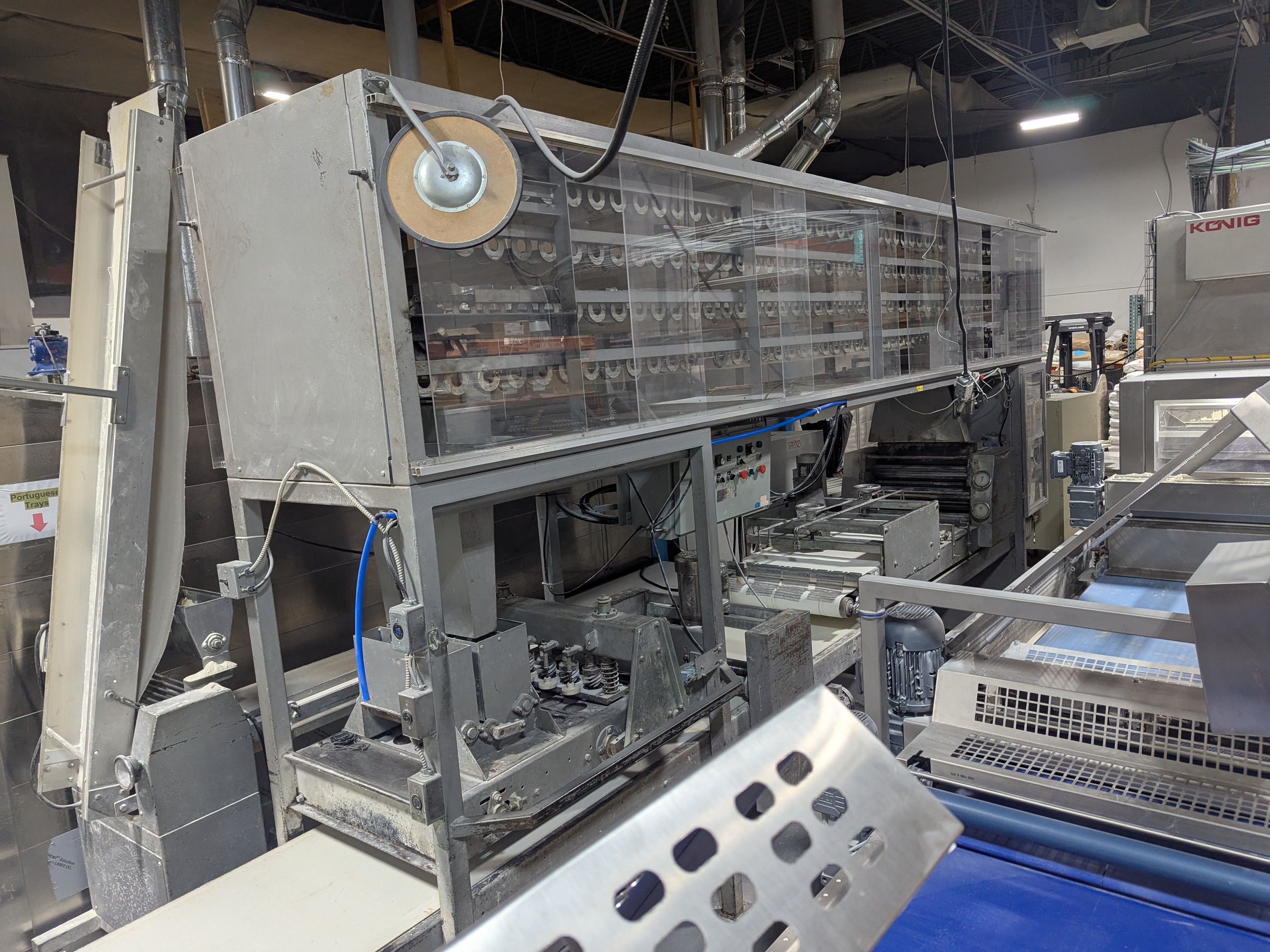 This bun line was used for 12" sub buns, hot dog buns, kaiser buns, Portuguese buns, dinner rolls, and more. In production, it typically ran 2,500 - 3,000 buns per hour but can run faster depending on the divider feeding the line. This line does not include a dough divider/portioner. Manufactured by Correct Design Bakery Equipment in Canada. The estimated manufacture date is 1990.